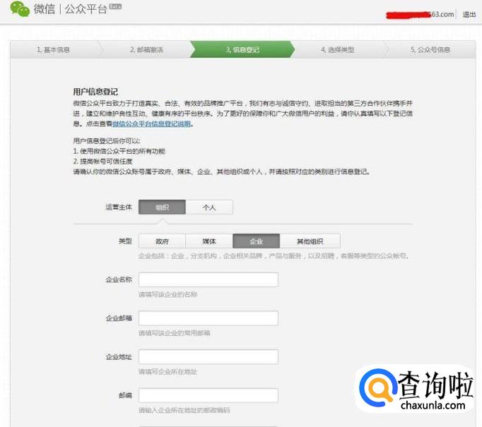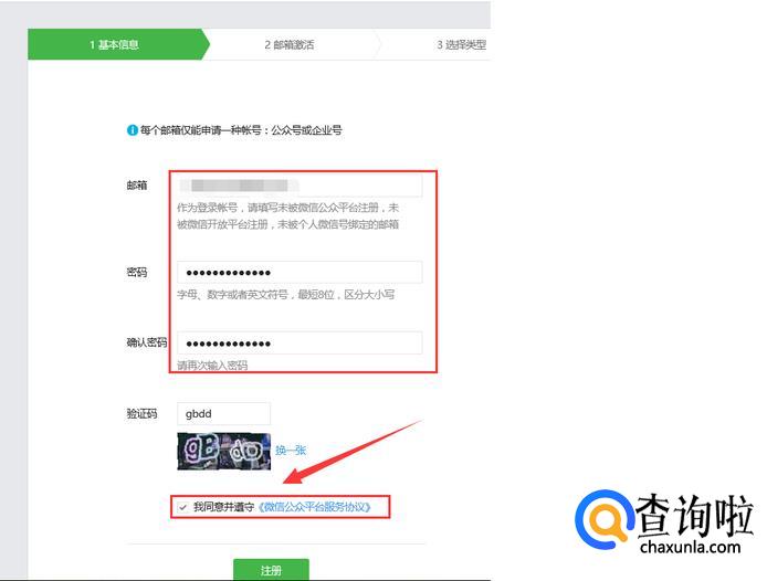 进入后输入你的邮箱网站,输入密码和验证码,在【我同意并遵守《微信公众平台服务协议》】打钩后点击注册。