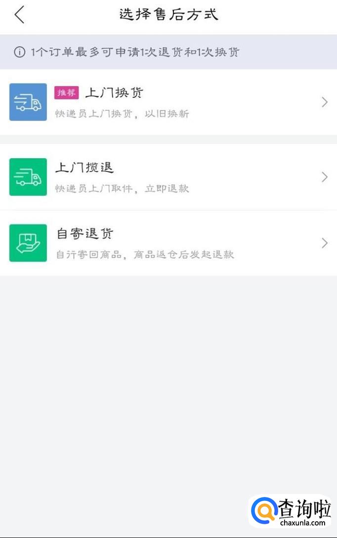 进入后,上面会出现上门换货、上门揽退、自行退货三个服务项目,选择上门揽退就可以了。