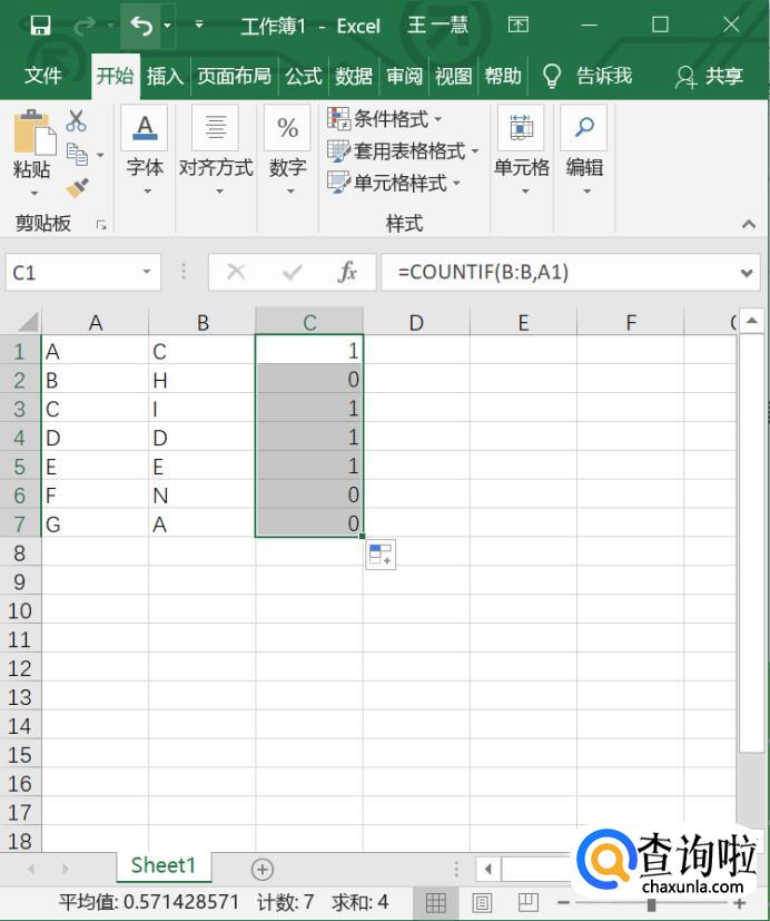 第三种方法:公式改为=COUNTIF(B:B,A1),然后下拉,也有两种显示情况,第一种是1,它代表A列中内容在B列中存在;第二种是0,它代A列中的内容在B列中不存在。