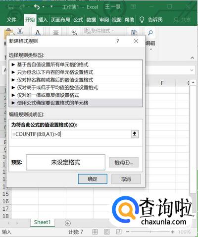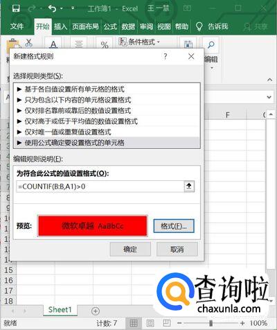 再在公式下输入=COUNTIF(B:B,A1)>0,点击格式。