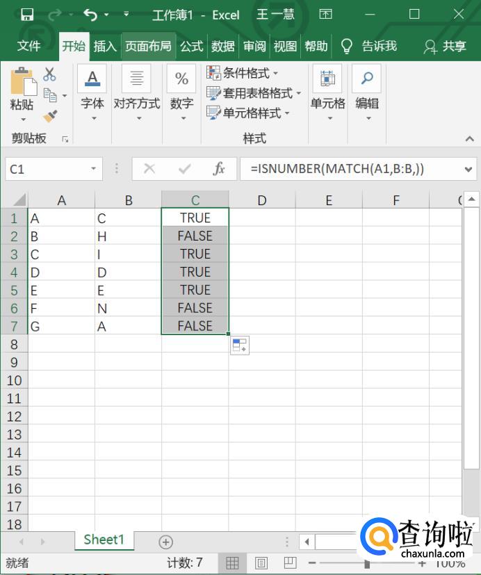 第二种方法:公式改为=ISNUMBER(MATCH(A1,B:B,)),也有两种显示情况,第一种是TRUE,它代表其返回值是数字,即A列中第一行的内容在B列中存在;第二种是FALSE,它代A列中第一行的内容在B列中不存在。