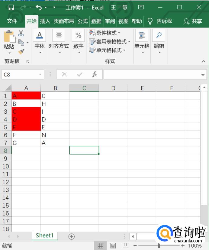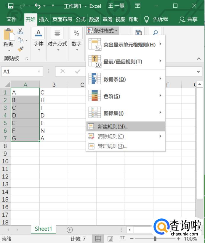 如果要更确切地知道A列中的哪些内容在B列中存在,可以先选中A列的数据,再在工具栏的“开始”中找到样式,点击条件格式,点击新建规则。
