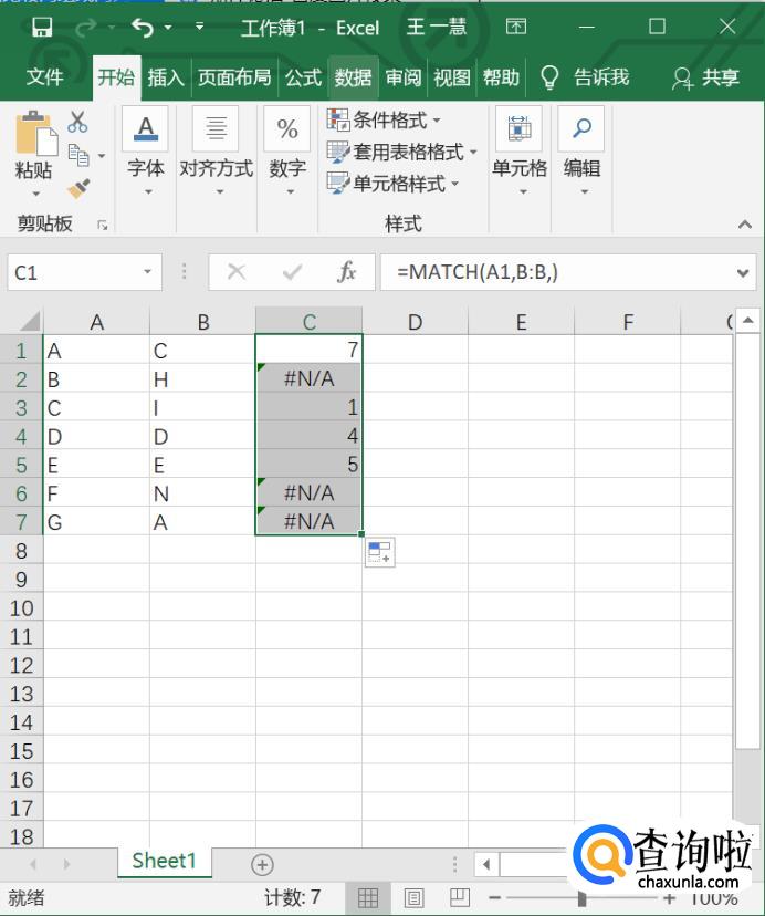 第一种方法,在C列的第一行输入公式:=MATCH(A1,B:B,)接着回车,会有两种情况出现 ,就一种显示的是数字n(n=1,2,3,4,5……),它代表A列中第一行的内容在B列中第n行存在。第二种显示的是#N/A,它代表的意思就是A列中第一行的内容在B列中不存在。
