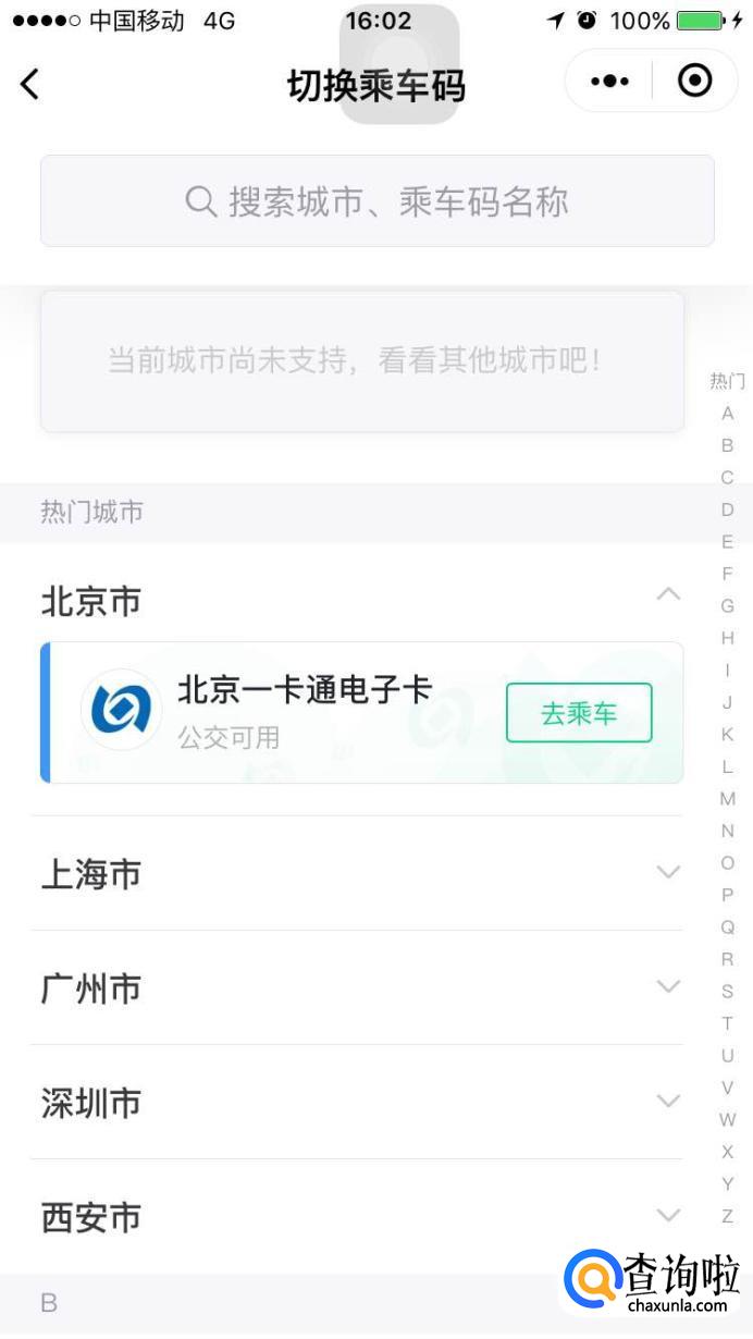 小编这里用北京市的一卡通为大家详细解释操作步骤。在已开放列表中,点击北京市一卡通右侧的“去乘车”。