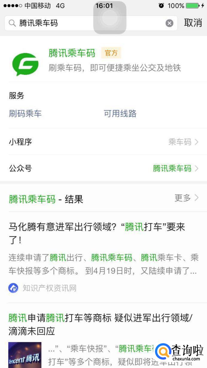 点开小程序,搜索“腾讯乘车码”,点击显示有官网字样的第一个。