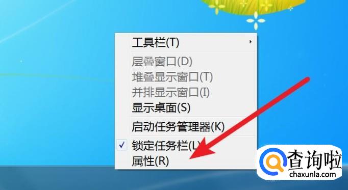 右键点击任务栏,在弹出的菜单上,点击‘属性’。