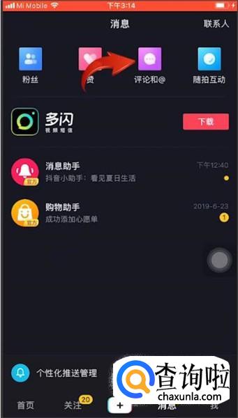 或者我们可以直接在消息页面点击评论和@,点击别人回复过的评论,也可以看到自己评论过的视频。