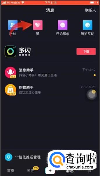 首先我们打开手机上的抖音,如果没有下载的话可以去应用商店下载,打开之后我们点击消息---赞就可以看到被别人点赞过的评论,顺着评论可以找到我们评论过的视频。
