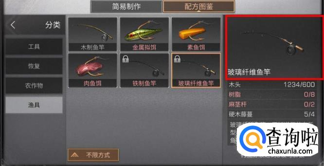 制作配方需要600木头,8树脂,2麻杆茎,4硬木藤蔓,材料一定要找够,找齐了即可制作鱼竿。