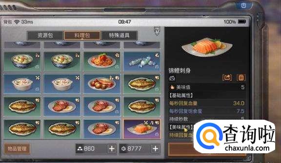 锦鲤刺身效果:每秒回血和饱食度,持续5秒,还增加各种采集暴击率和对于怪物的伤害,是一个非常全面的料理。