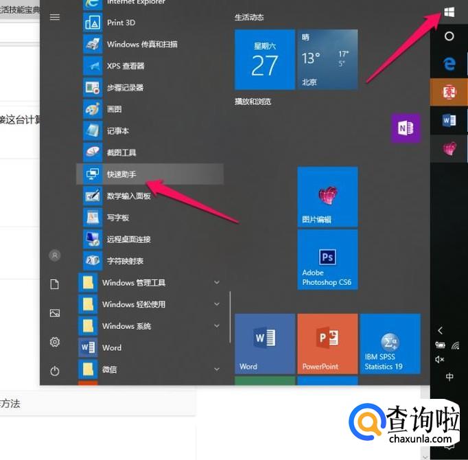 接下来找到【快速助手】应用,打开【开始菜单】---【win10附件】---【快速助手】