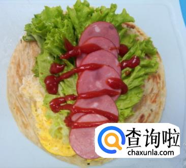 手抓饼、鸡蛋、火腿肠、沙拉酱、肉松
