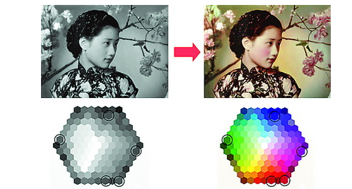 是不是一旦进行了有损压缩,数据缺失了,画质就很难复原了?是很难复原,但这也并不是完全不可能,这里面有个关键的概念是“先验信息”(先验信息也就是我们以前已经知道了的知识)。例如下图左边这张民国女性黑白照片的嘴唇,要压缩成这个灰度,右边的彩色图例中有五种可能,但通过先验信息知道,美女的嘴唇不可能是绿的、蓝的和紫的,只能是右下的红色,把它还原成红色就对了。