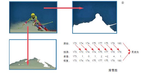 知道了图像数字化的道理,再来看图像为什么可以被压缩和还原。先看一张滑雪图,由于人体的色彩变化比较多,而天空和雪的色彩却非常单调,可以想象,天空与雪所代表的每个小格颜色的数值应该非常接近,图右下的原始数据是8个相邻格子的色彩数据,由于两个相邻格子的数据差异很小,所以可以用第一个格子的数据来表达第二个格子数据的预测值,经实际测量后,把真实值与预测值的差值求出来,并利用这个差值来表示第二个格子的色彩,那么,实际记录下的就是第三行差值。恢复数据时,用前面一个值加上差值,就是当前的色彩值,只要有第一位的基础值,后面的色彩值就可以滚雪球似的一个个求出来。用差值来记录色彩,只是简单地进行了很多个减法运算,在还原时再加回来,数据并没有一丁点的损失,因此被称为无损压缩。如果把很少的差值彻底丢弃,在还原时让一个格子的色彩信息代表了周围很多格子的色彩,则压缩率更高,但这样一来格子之间的微小差别就丢失了,这种方法属于有损压缩。