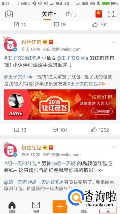 首先,请大家打开新浪微博客户端,登录微博账号之后,在主页面中点击右下角“我”选项。