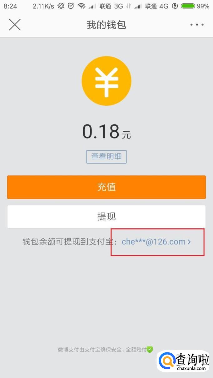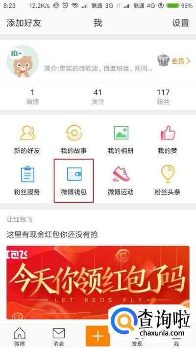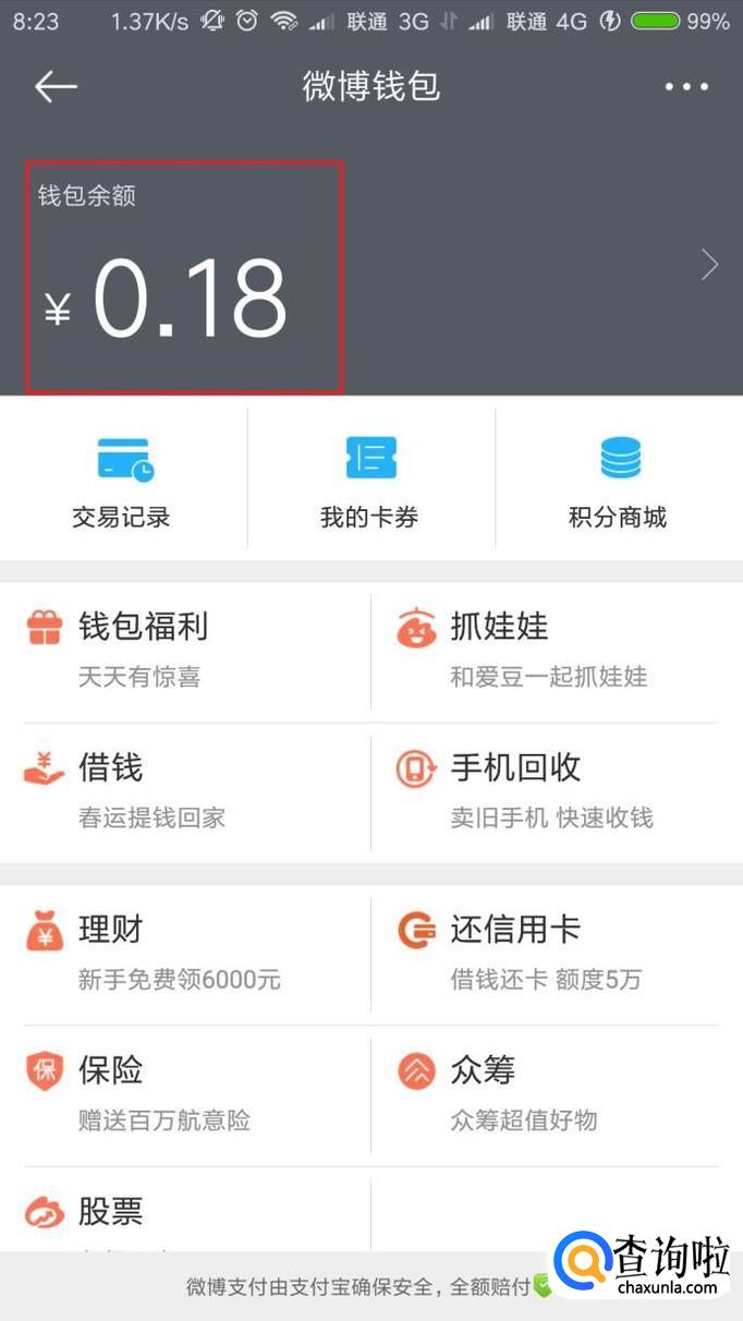 打开微博钱包账户之后,我们可以看到当前自己在微博账户中的余额,点击余额选项即可查看到当前微博钱包中的金额。