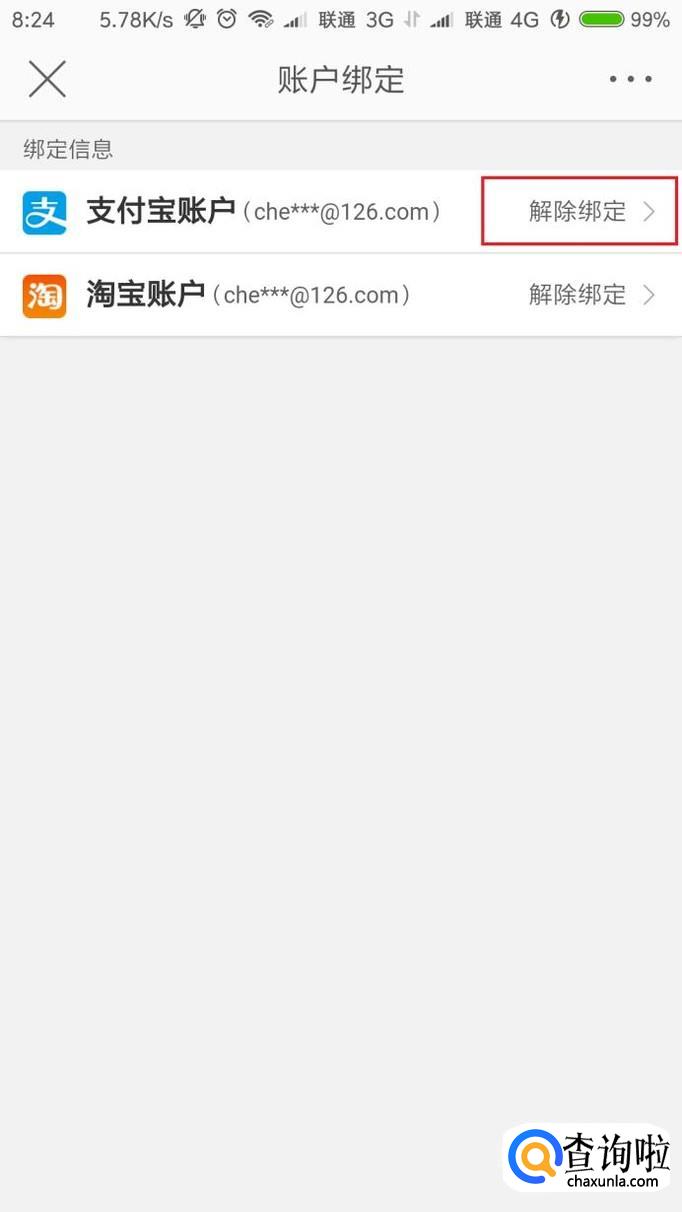 在接下来打开的页面中,点击“解除绑定”按钮,即可进入到支付宝账户接触绑定页面。