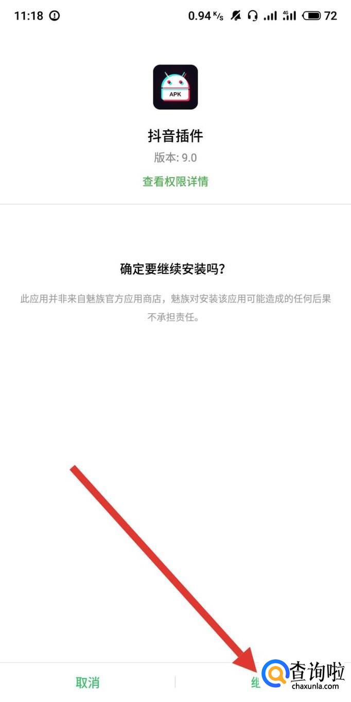 进去之后,点击“继续”,将抖音插件安装到手机上,如图所示。