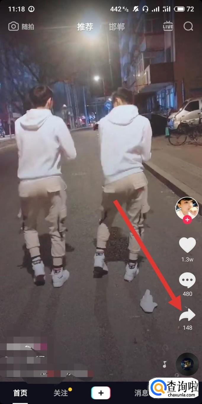 进去抖音找到想设置动态壁纸的视频,点击“分享”按键,如图所示。