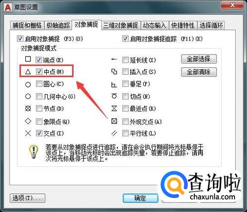 点击捕捉设置选项在弹出的对话框内将中点勾选,如图所示: