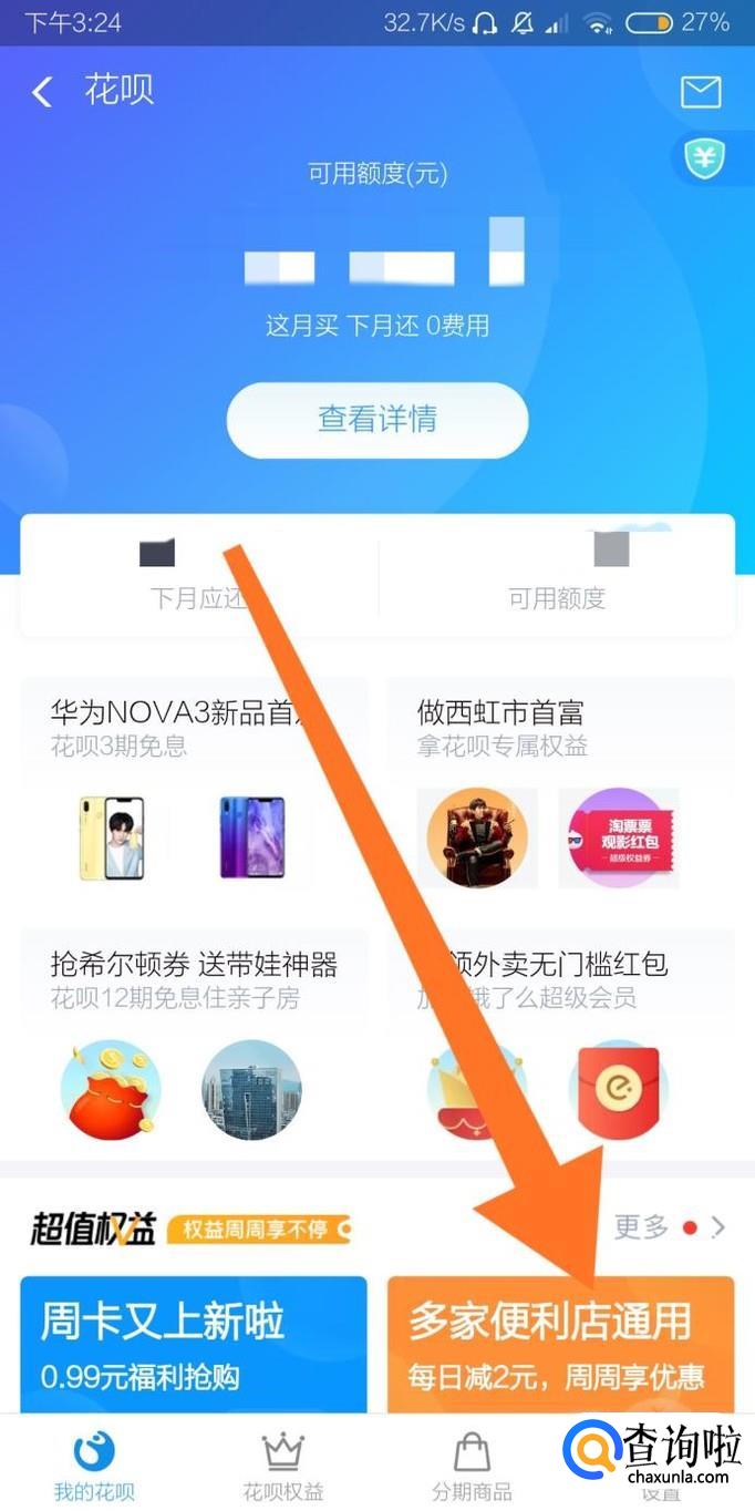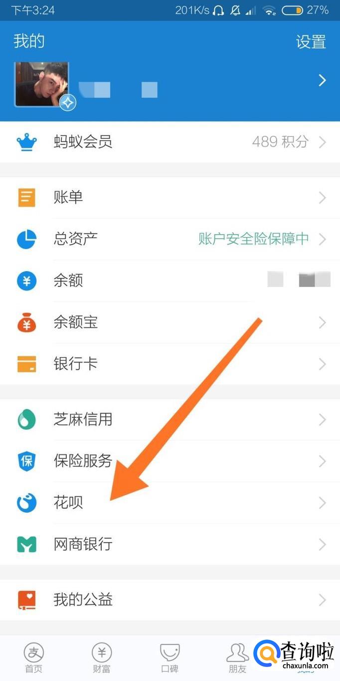 首先点击进入支付宝“我的”页面,再点击进入“花呗”选项。