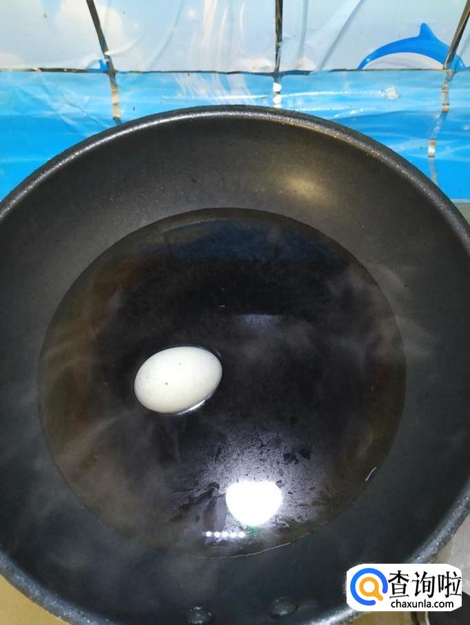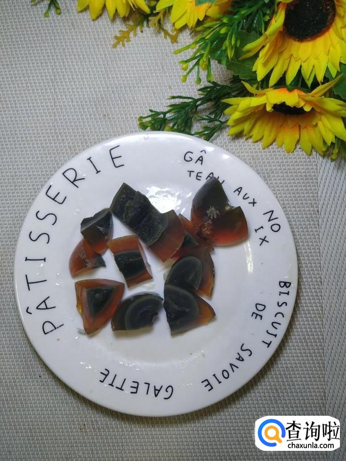 将买来的皮蛋,放入锅中煮三四分钟,盛出,过凉水放凉后,去除外皮,切成小块,放入盘中备用。