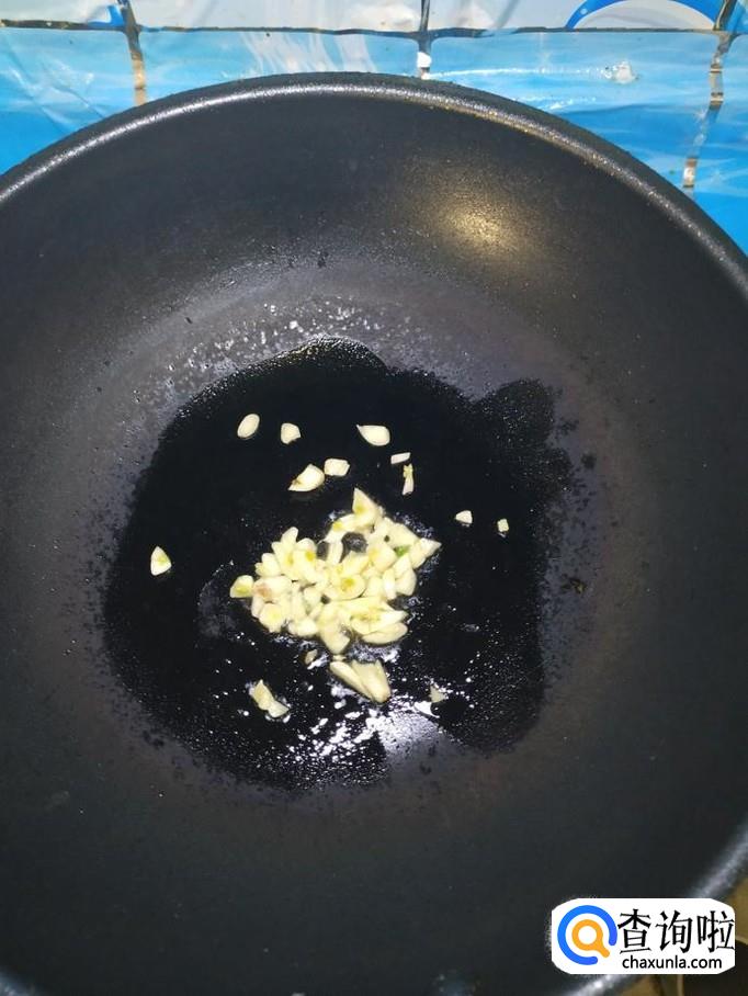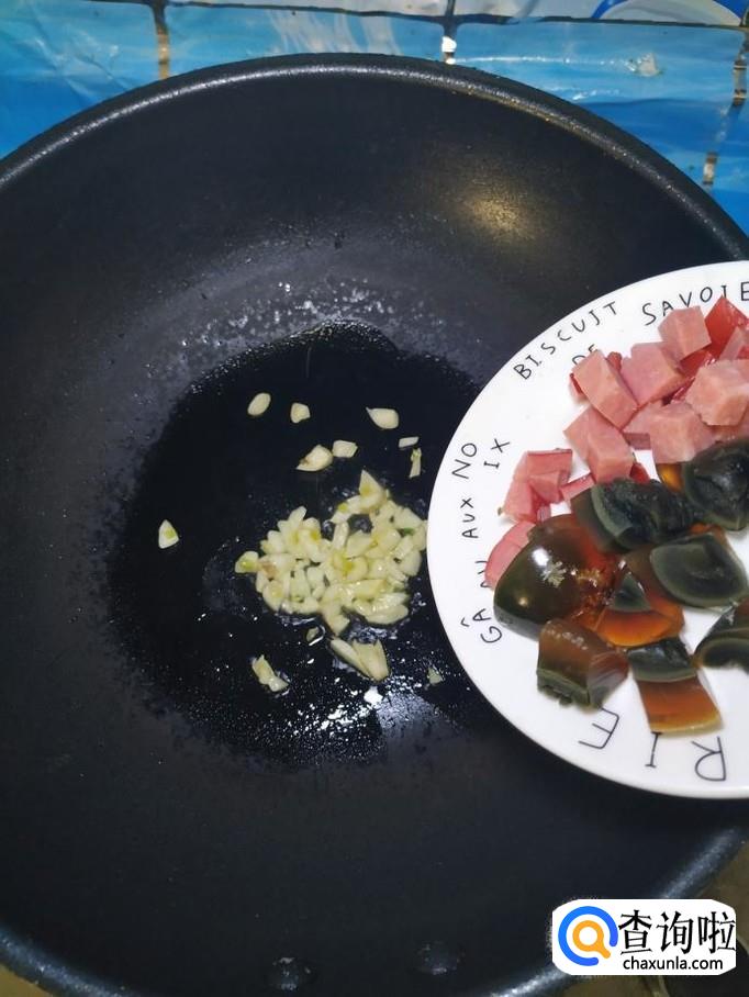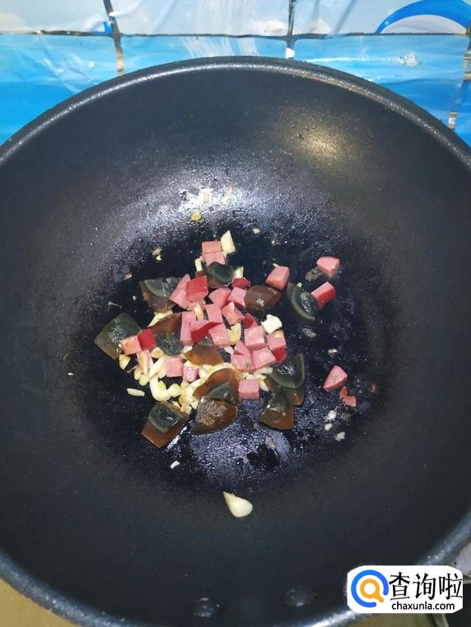 将蒜去外衣后,切碎,炒锅中放入适量油,将蒜末放入锅中炒香,然后将准备好的松花蛋和红肠块倒入锅中,翻炒均匀。