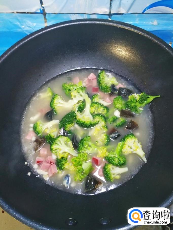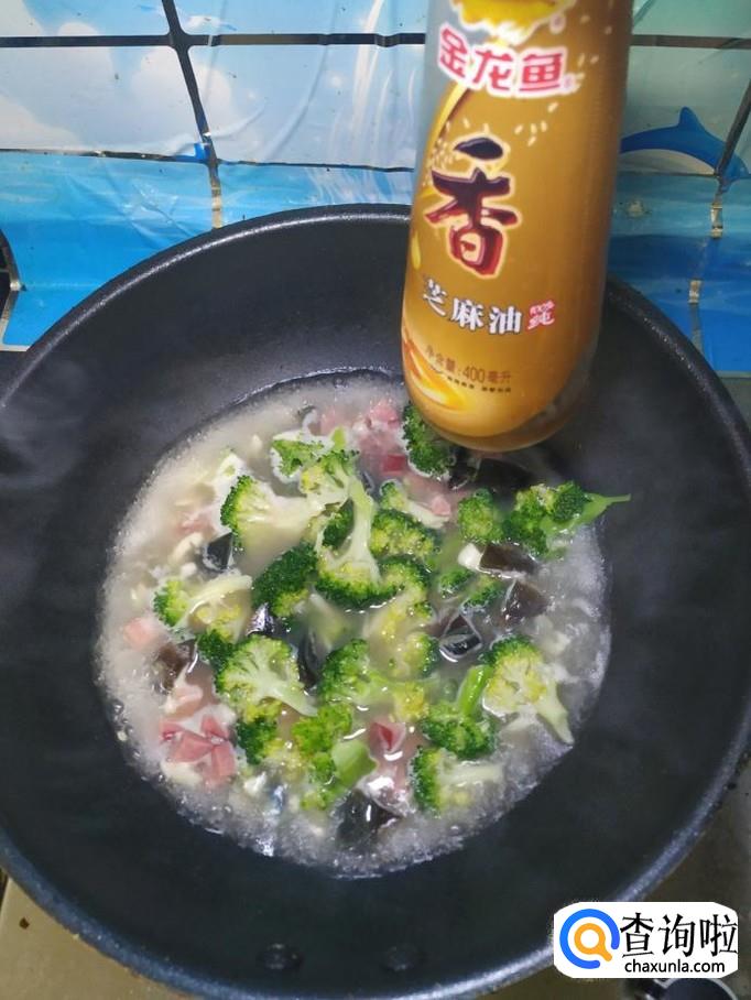将之前焯好水的西兰花倒入锅中,再煮两分钟左右,然后滴入适量香油。