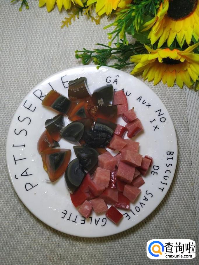 准备适量西兰花,用手小心的撕成小朵,放入清水中洗净,控干水分,备用;再准备适量红肠,切成小丁儿,和之前切好的松花蛋放在一起。