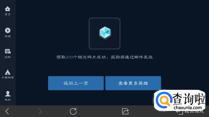 在左上角英雄的名字下面会有两个小箱子,点击一下就能领取了,第一个是50,第二个是200铭文碎片。