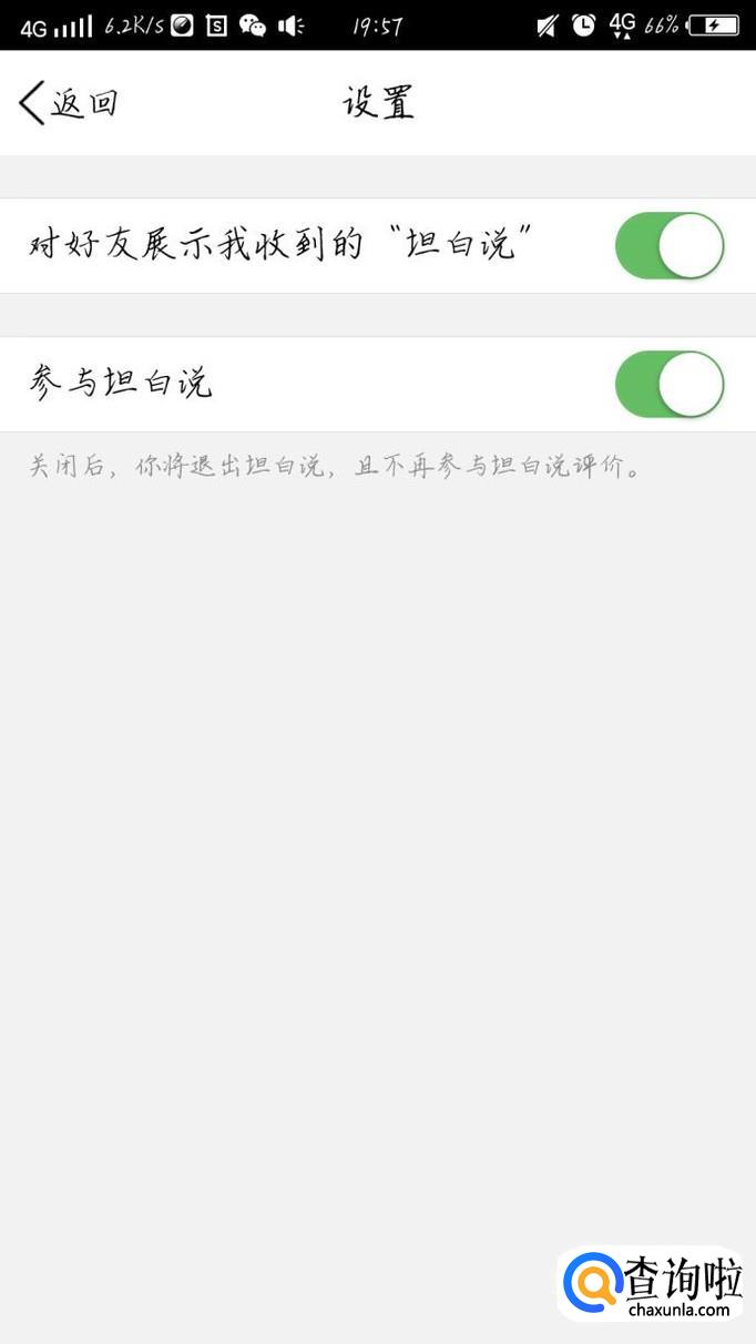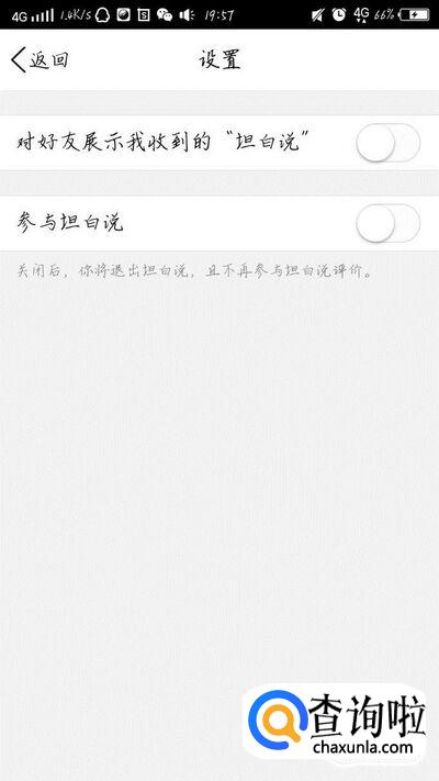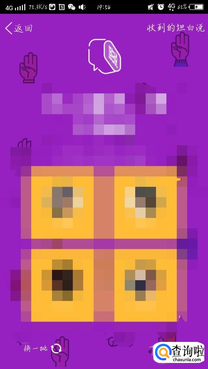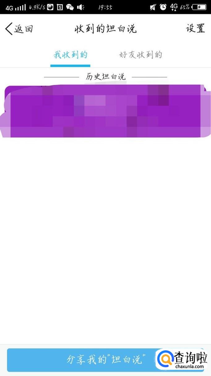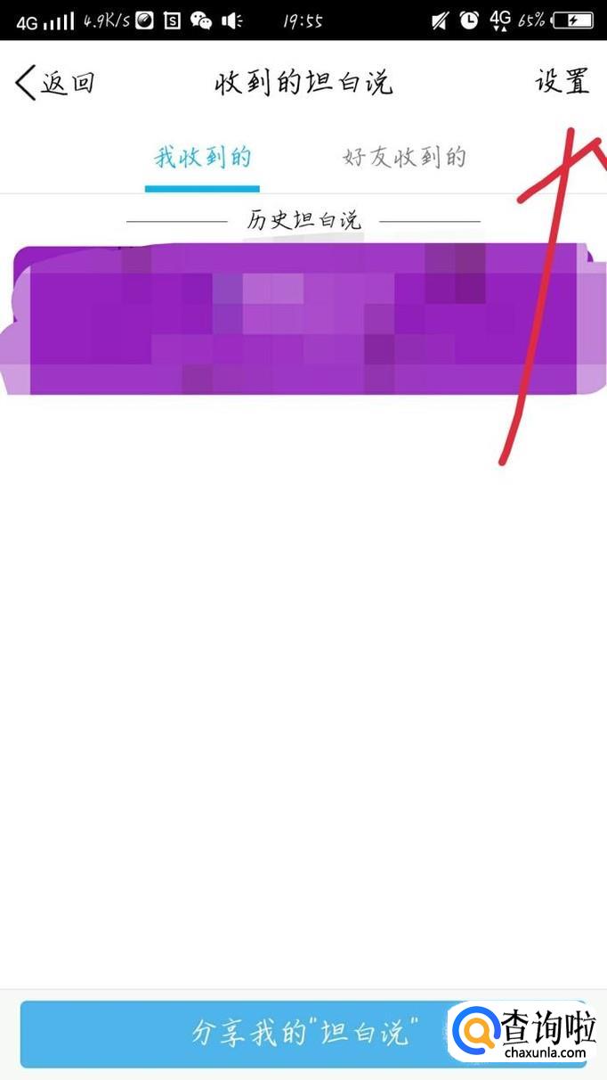 点击右上角的我收到的坦白说,进入一个新的界面,如图1所示。再点击右上角的设置,如图2箭头所示。会进入一个新的界面,如图3所示。把参与坦白说关掉,如图4所示