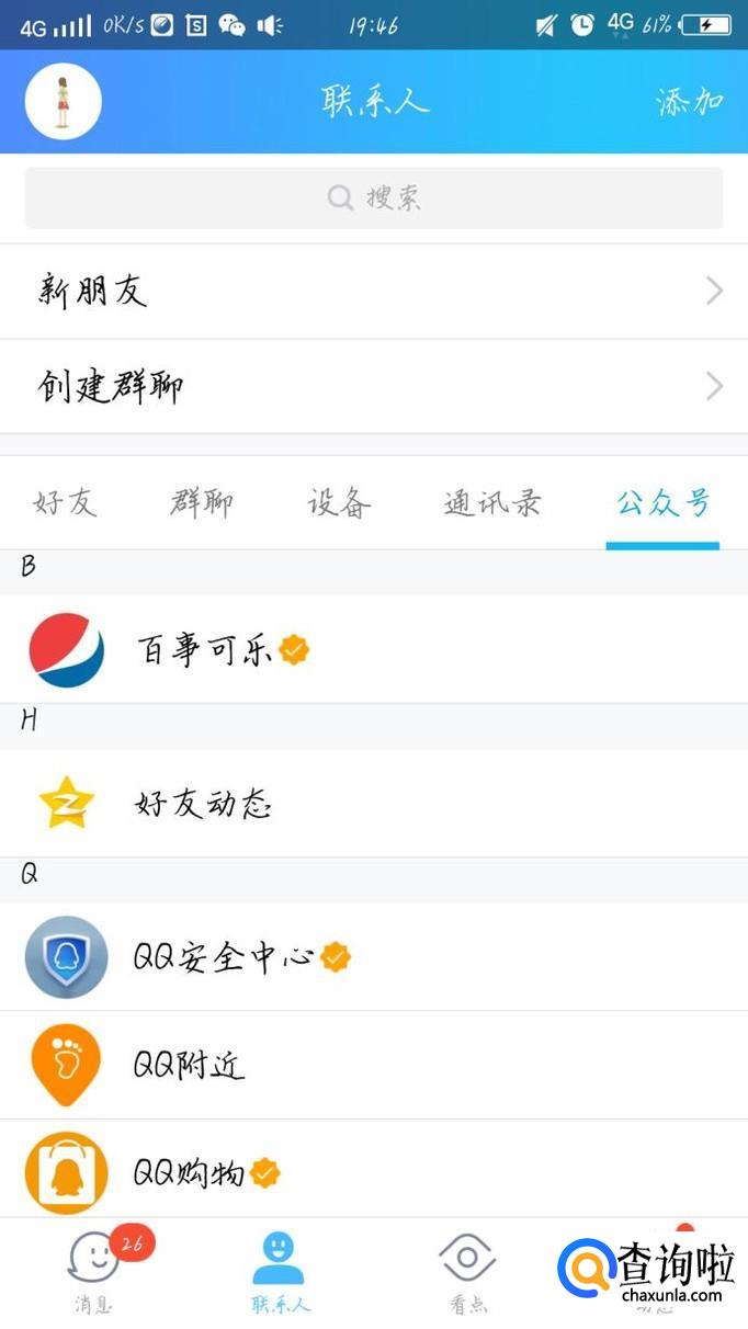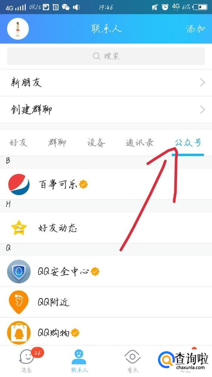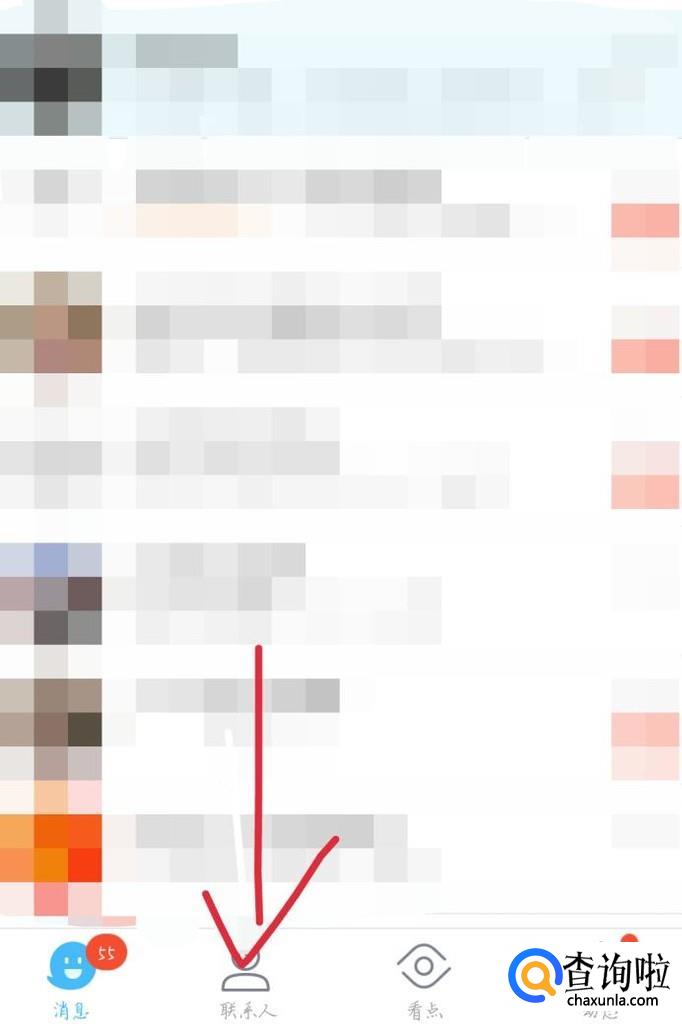 首先打开手机qq这个软件,如图1所示。点击最下方从左往右数第2个联系人按钮,如图2箭头所示
