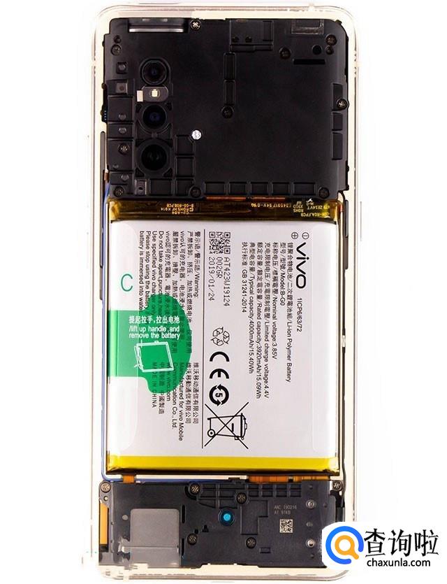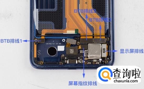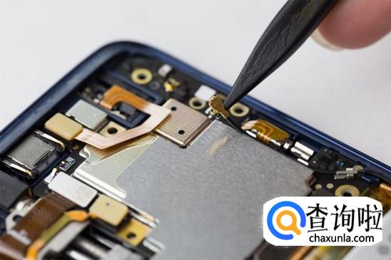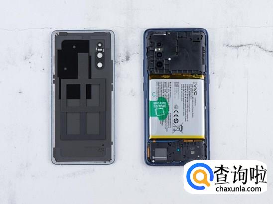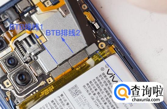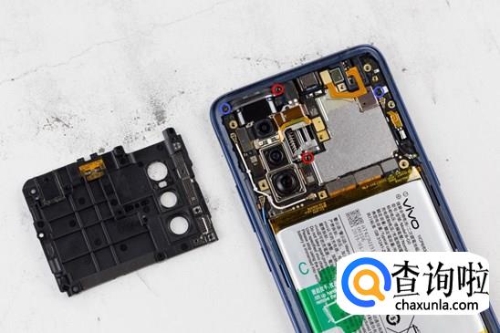 图为vivo X27内部结构特写,尽管是传统的三段式结构,但从摄像头位置和副板上的蓝色斑点就能感受到这不手机做工不一般。