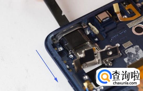 然后使用撬棒,沿着箭头方向,将前置摄像头顶出固定框,将整个前置升降模块分离出来。