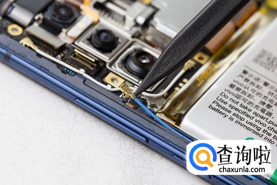 想拆下主板,先用从排线下手。因为vivo X27的设计有点复杂,排线有点多,所以一定要按着步骤来。先撬起电池排线,然后撬起两条BTB排线。