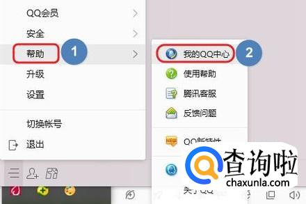 首先打开QQ面板,然后点击左下角的“菜单”按钮,如图一...然后在弹出的窗口中依次点击“帮助”-“我的QQ中心”;