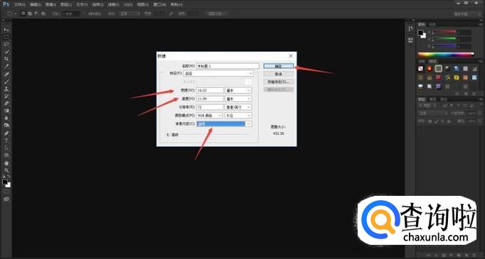 系统弹出新建窗口,我们根据水印大小合理设置画布大小即可,在“背景内容”选项中,选择“透明”属性。