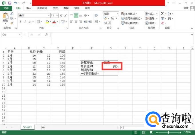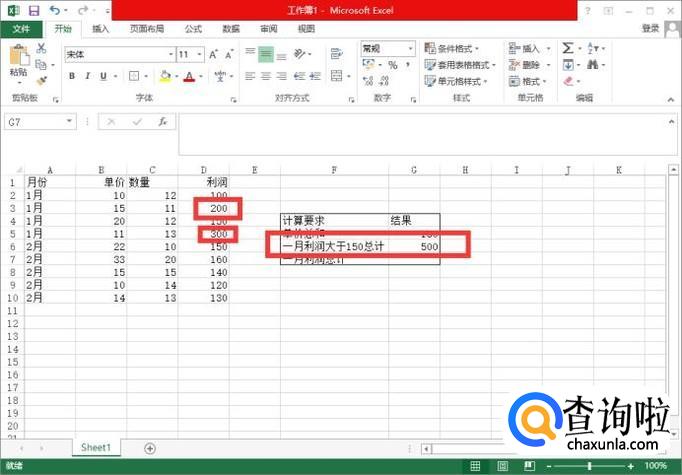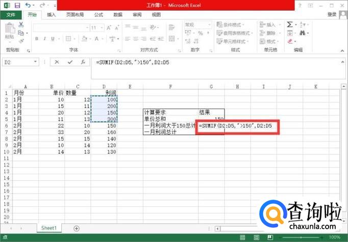 现在求一月份利润大于150的总和,用SUMIF函数,输入=SUMIF(D2:D5,“>150”,D2:D5),按enter键。