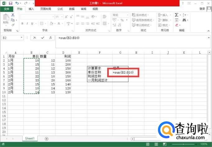 先看简单的求和,在单元格内输入=sum(B2:B10),然后按enter键。