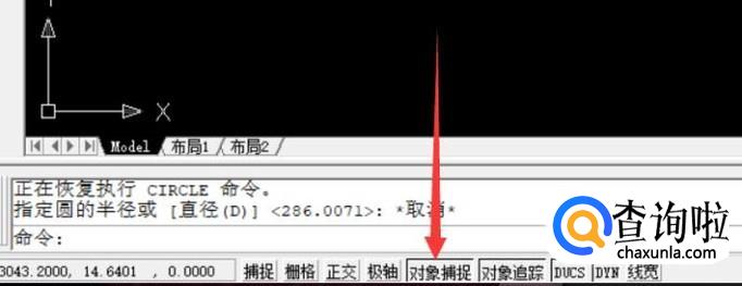 然后打开命令栏下方的对象捕捉,然后选择交点这个选项,这样就能自动找到两圆相交的地方。