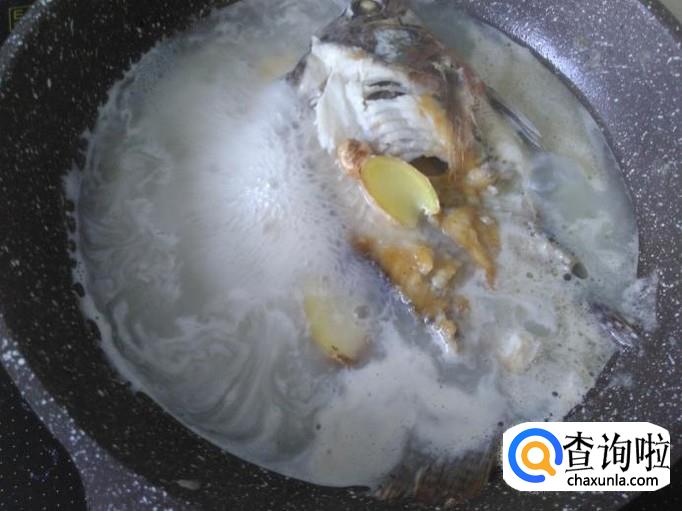炖到汤水变成奶白色后,把鱼骨和姜片捞上来。