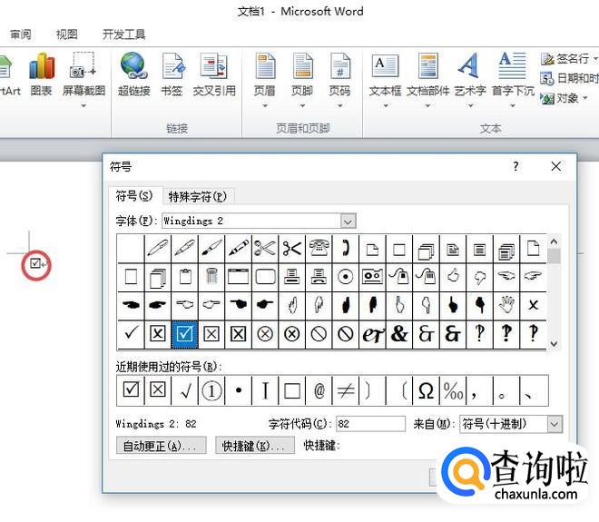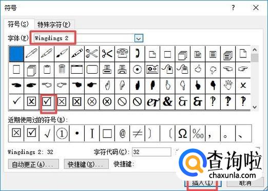 之后我们将弹出界面中的字体设置成Wingdings 2,然后我们就可以看到方框对号的符号了,我们点击选中,然后点击插入;