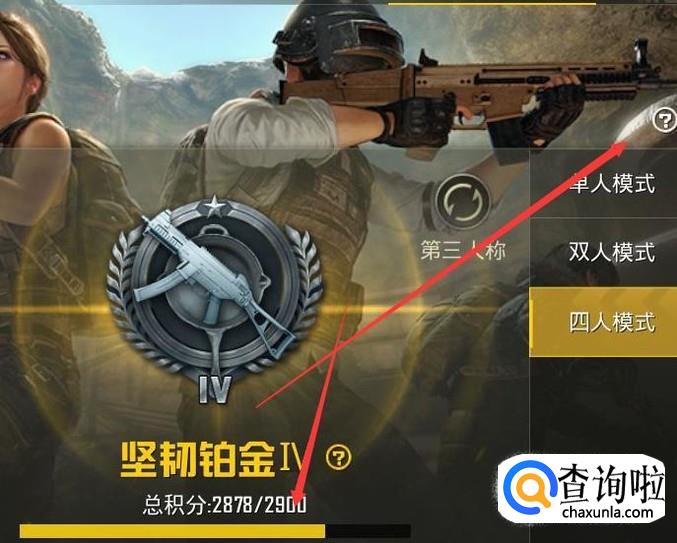 进入之后你会看到我的段位是白金四,下面的积分达到2900分就会提升一个段位了。如下图,查看完毕之后再点击右上角的问号。