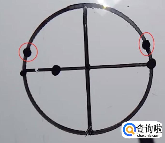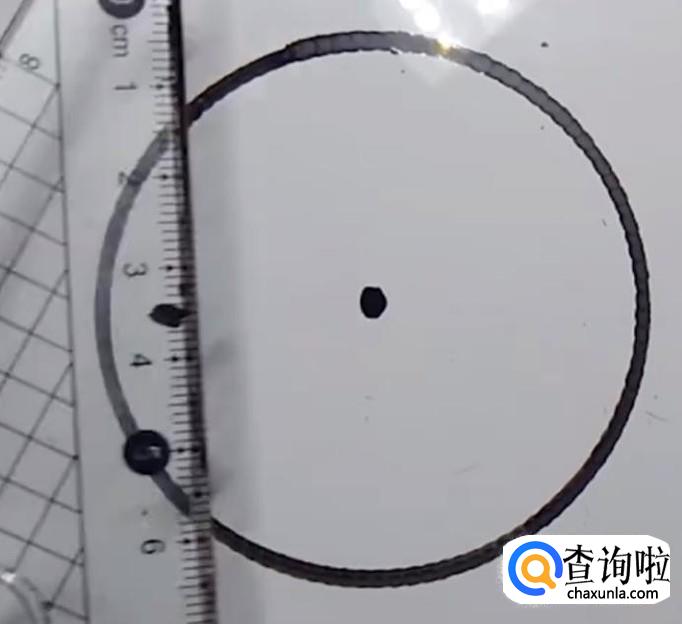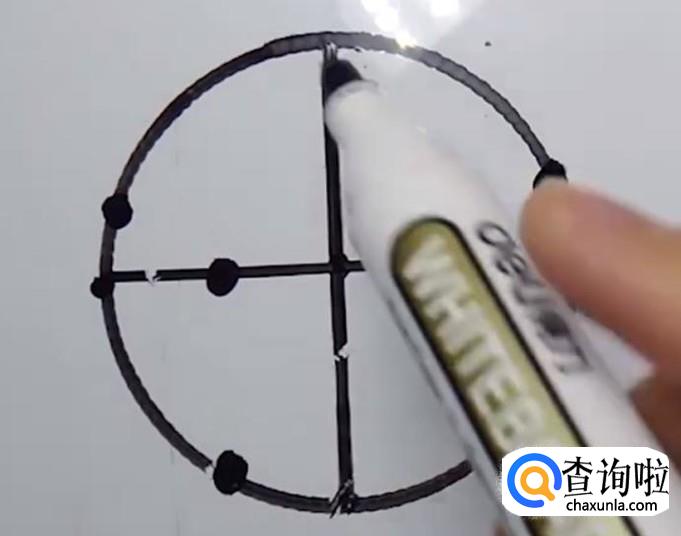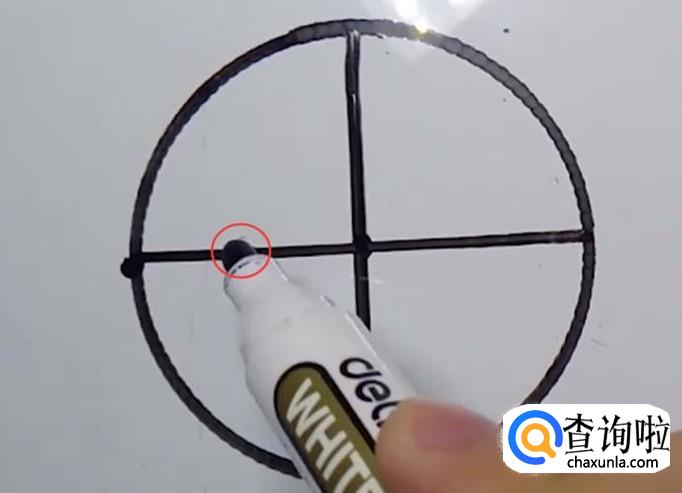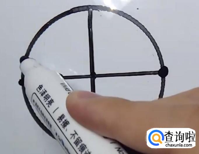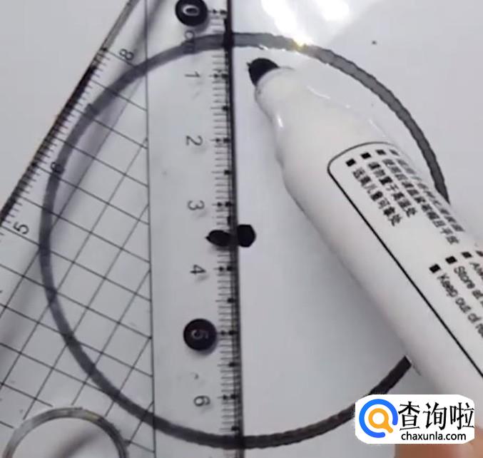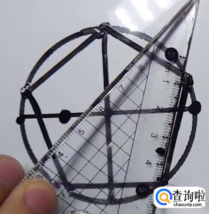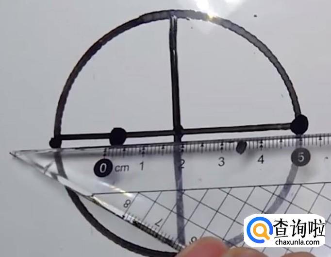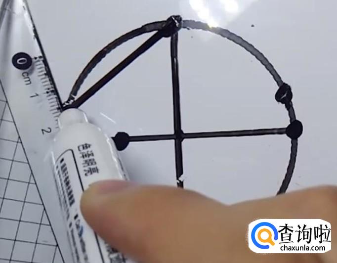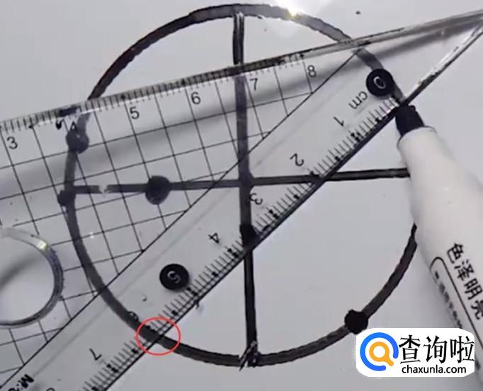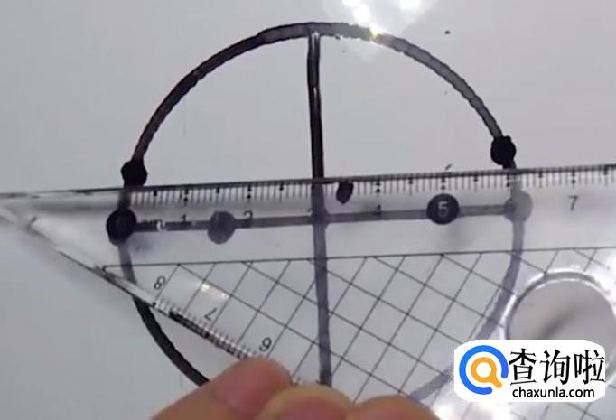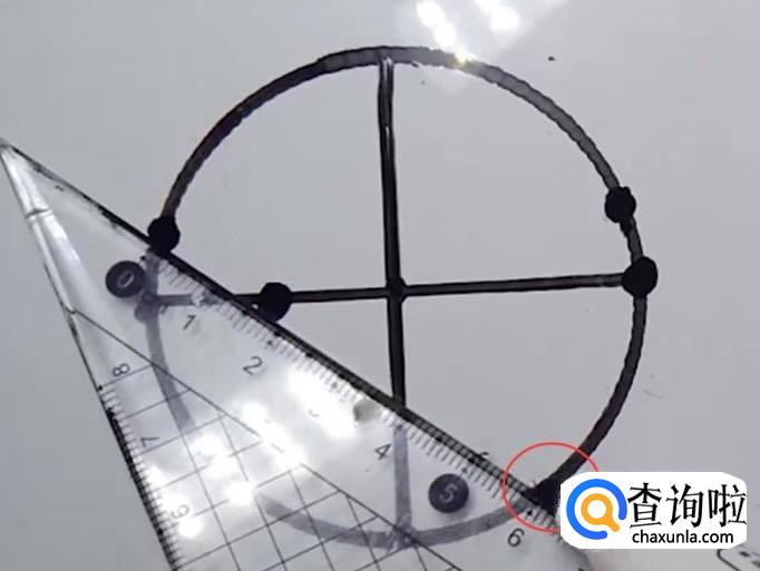 按图所示,将斜上方两点为一条线,延伸到右下角圆弧处,标注一个点。