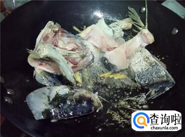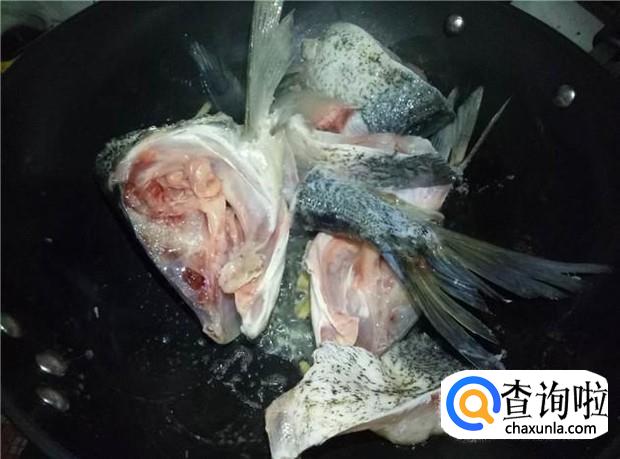 然后再倒入大头鱼,先把鱼头和鱼肉煎几分钟,这样做出来的鱼头汤更加香。