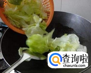 将生菜倒入锅中,开大火快速翻炒。