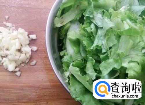 将生菜洗净,分成一片一片的叶子,再准备蒜,切成末。
