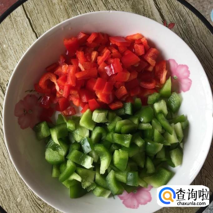 将青椒和红椒分别去蒂去籽后清洗干净,再切成丁状;