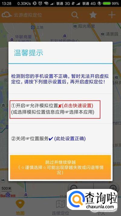 如果你的手机还没有对该应用添加允许位置模拟的应用权限,APP会自动弹出相关页面,点击页面中弹出的窗口进入手机设置页面。