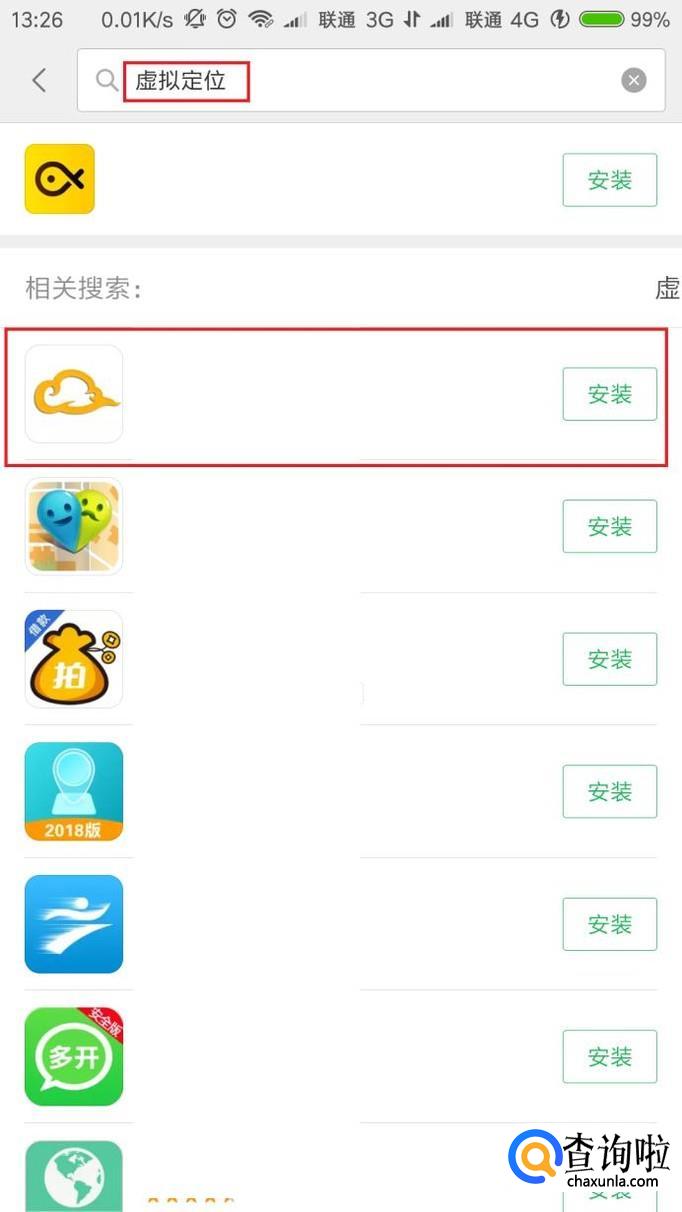 在搜索结果页面中,点击安装支持虚拟定位的应用APP,大家可以自行选择,这些APP的功能基本都大同小异。